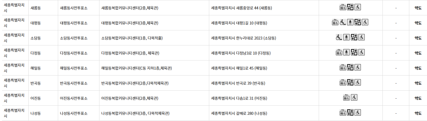 - 연동면 사전투표소: 연동면복합커뮤니티센터 (1층, 다목적체육관), 세종특별자치시 연동면 장욱진로 7, 장애인 편의시설 및 임시 기표소 설치 대상 여부 정보는 확인되지 않았습니다, 약도 제공