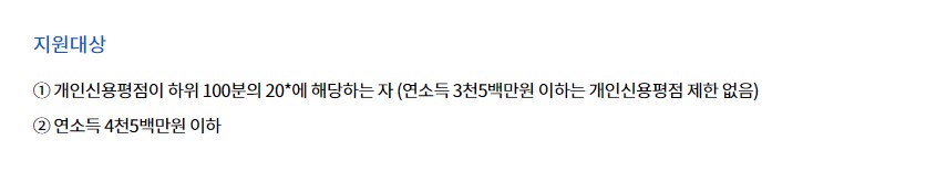 - 개인 신용 점수가 하위 20%에 해당하는 자 (연소득 3,500만 원 이하인 경우 신용 점수 제한 없음)